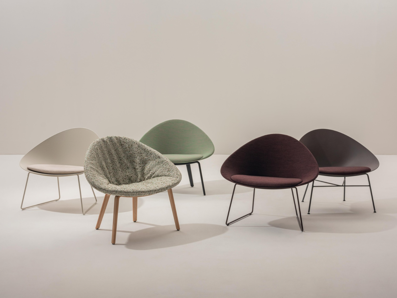 La carcasa de polipropileno reciclado se distingue por su textura única, que recuerda los patrones concéntricos de los anillos de un tronco de árbol. La carcasa está disponible en versión visible, con cojín de asiento o completamente tapizada. Para resaltar las delicadas formas de Adell, a la amplia gama de revestimientos de Arper se ha añadido otra opción específica: el tejido Atom (Kvadrat Raf Simons).