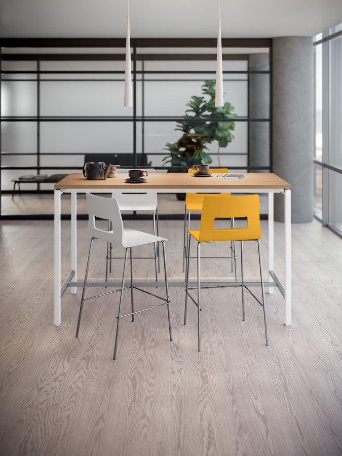 Está disponible en la versión silla y taburete alto, ideal para un espacio de cocina, comedor o restaurante.