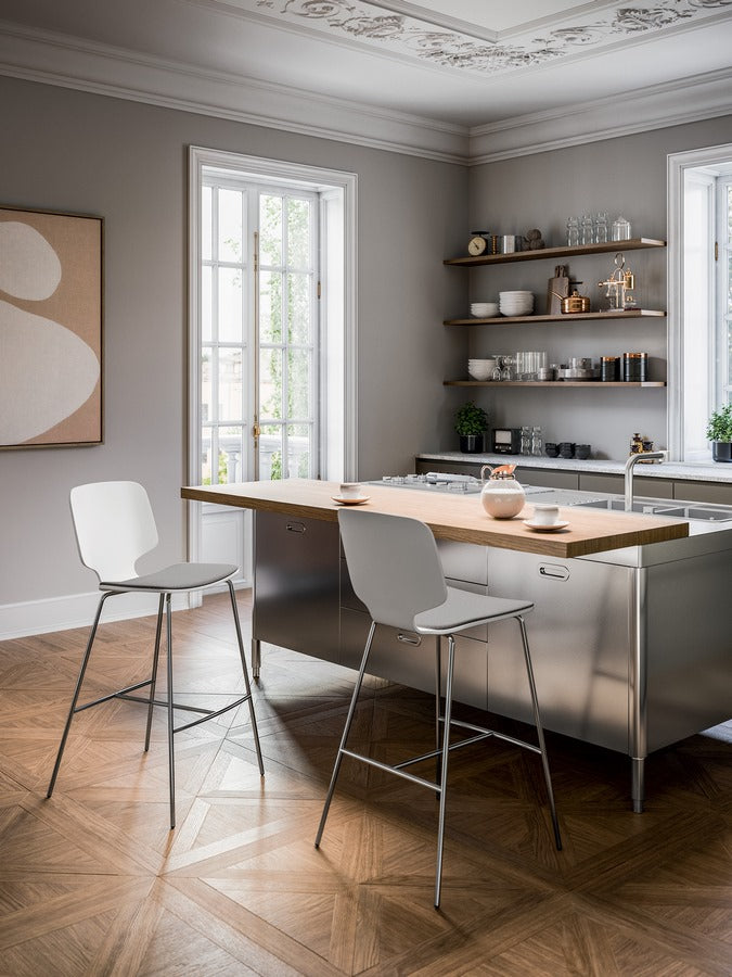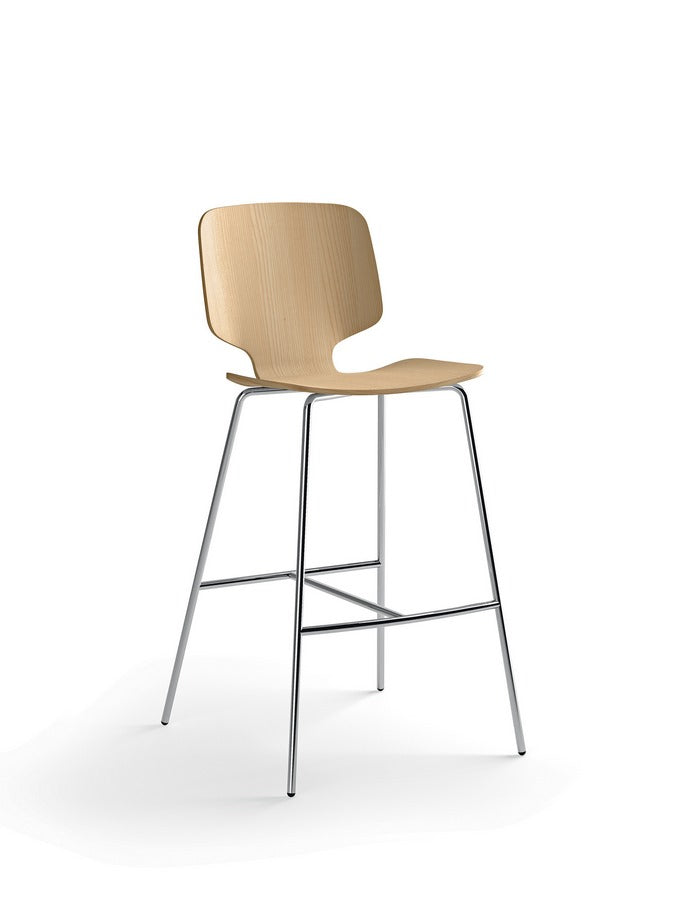 Las cautivadoras líneas de Code esconden un lado clásico atemporal, revisado con cortes y pliegues del respaldo y del asiento que se inspiran en las formas del cuerpo femenino. La versión taburete alto, con la carcasa lacada en multicapa de haya o chapada en fresno natural o barnizado nogal, es esbelta, práctica y funcional, perfecta para añadir un elemento distintivo a los espacios dedicados a la colectividad y la hostelería, gracias a los numerosos acabados disponibles.