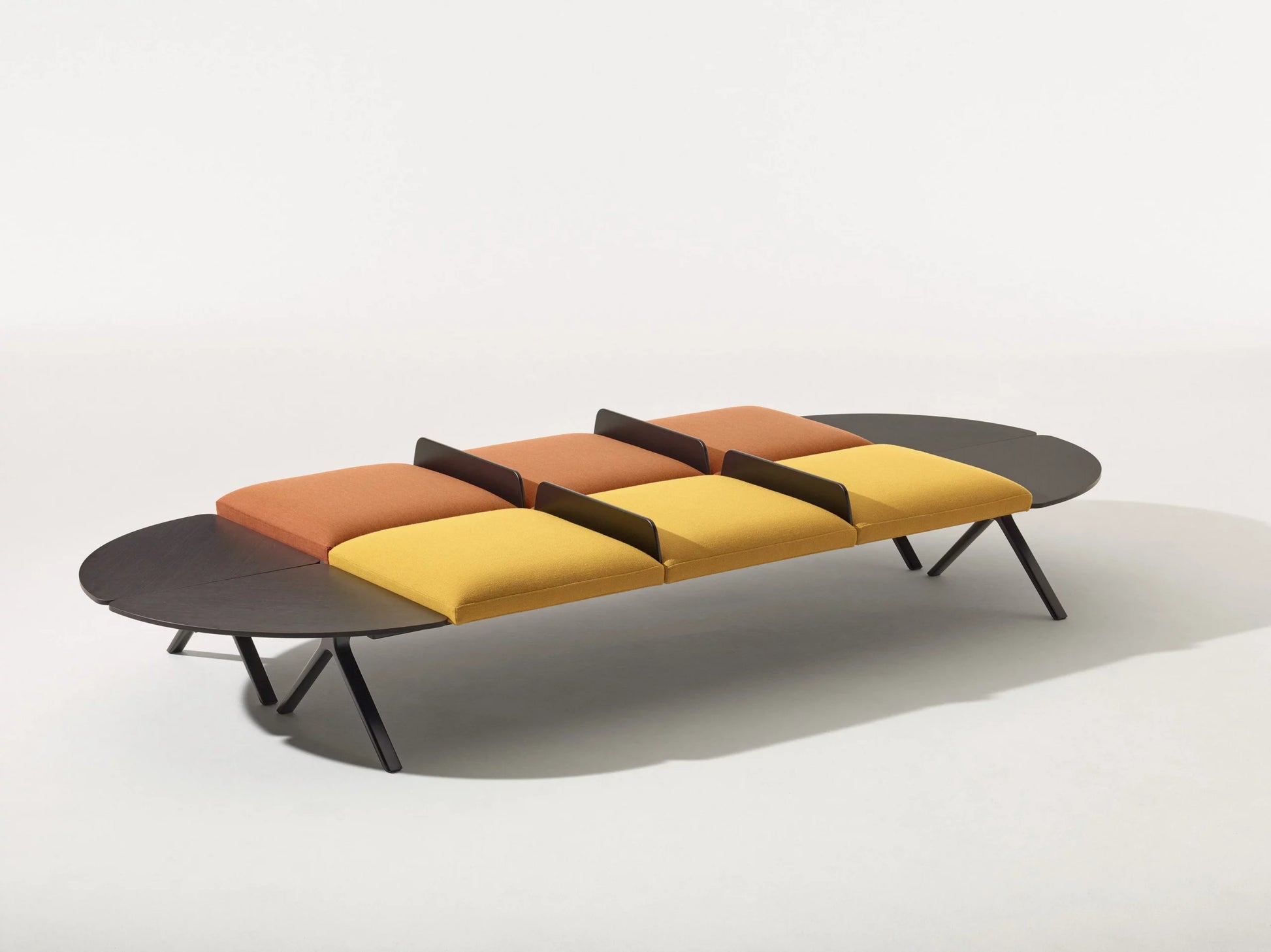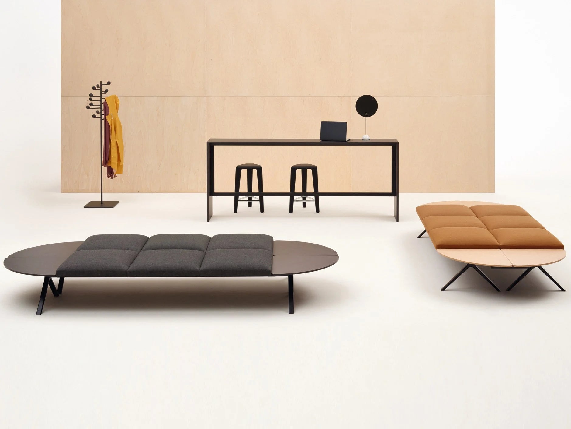 Ideal para contextos del sector de contratos, Kiik crea espacios a medida para trabajar, reunirse o tomar un descanso. Su carácter modular y la extrema variedad de configuraciones posibles lo convierten en un producto transversal apto para cualquier contexto: zonas de espera, espacios de trabajo y áreas de encuentro y uso compartido. La colección se caracteriza por sus estructuras modulares en tres longitudes diferentes, que pueden configurarse con asientos tapizados (con respaldo en dos alturas diferentes o sin respaldo) y mesas bajas de diferentes formatos. Las consolas de tres alturas y una otomana de seis plazas completan la colección. El nivel de confort y la funcionalidad de la colección se ven reforzados por los apoyabrazos (que pueden colocarse en los extremos o como separadores entre asientos) y las tomas USB aplicables a todos los elementos de la colección. Sumamente versátiles, las diferentes configuraciones se combinan para crear un efecto dinámico y dar ritmo a las formas recurrentes: Kiik está disponible en una amplia gama de telas, pieles y telas recubiertas.