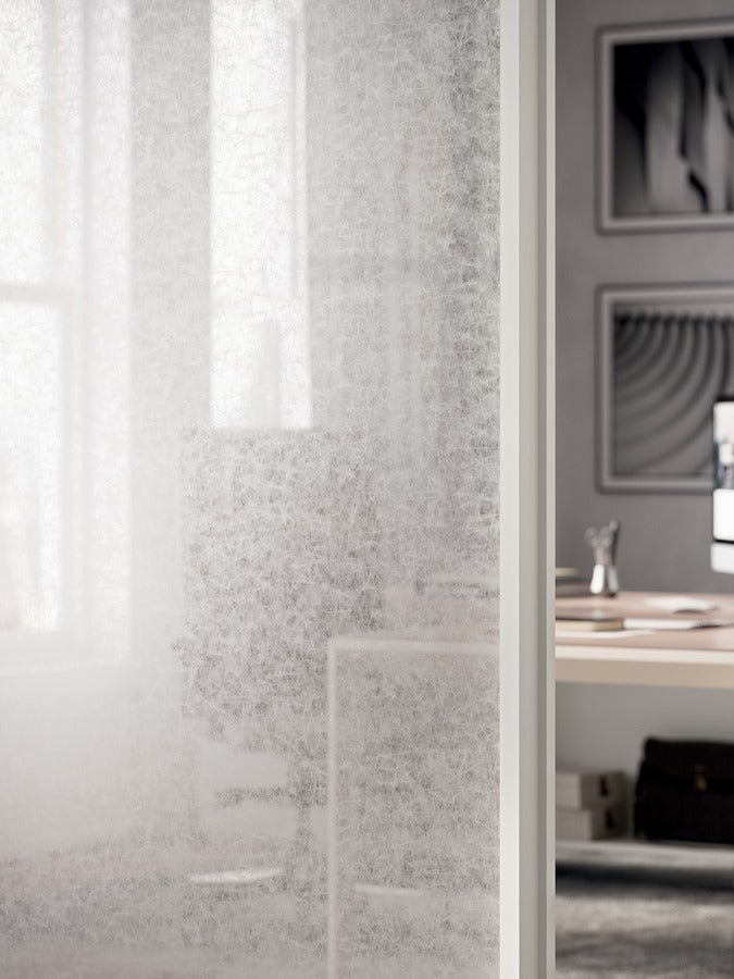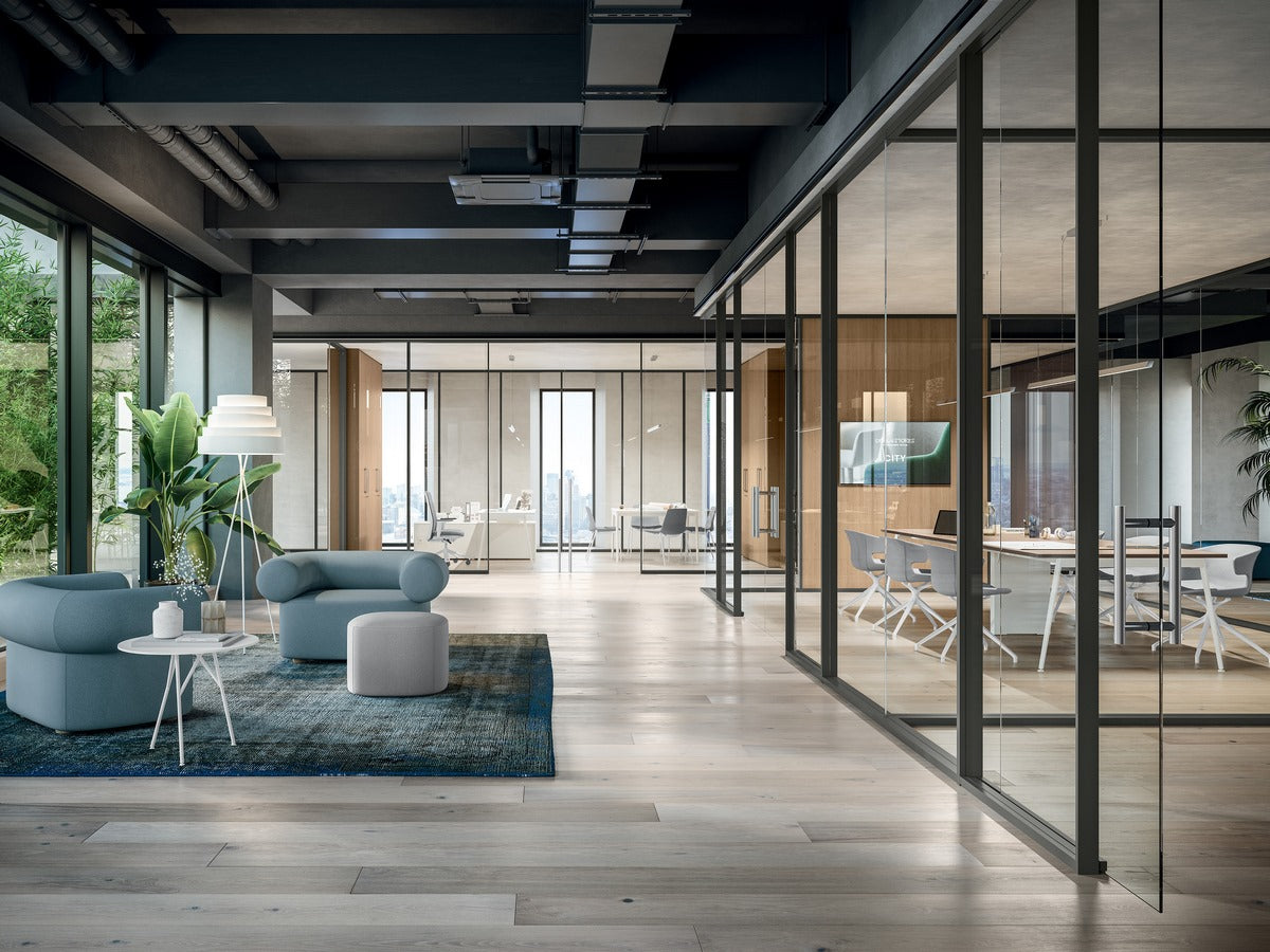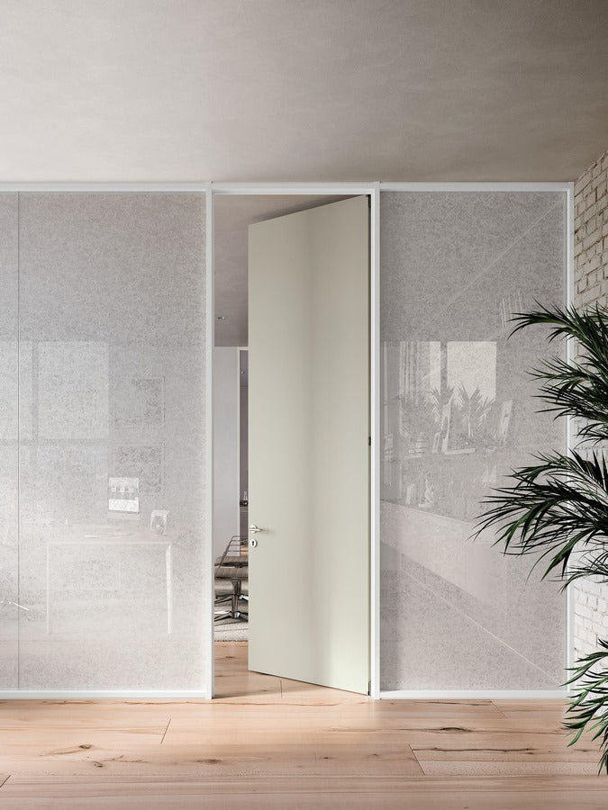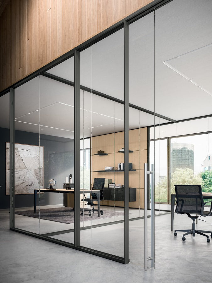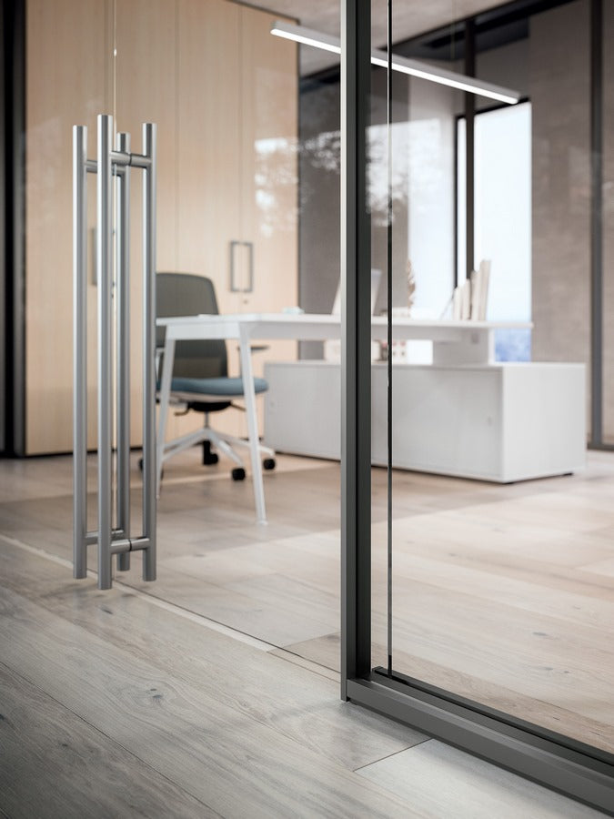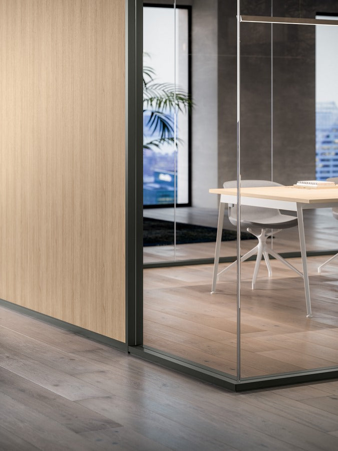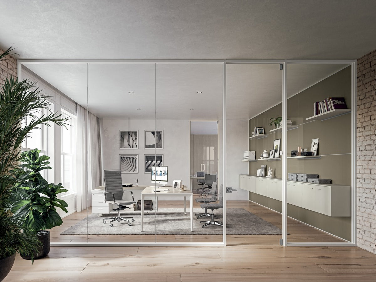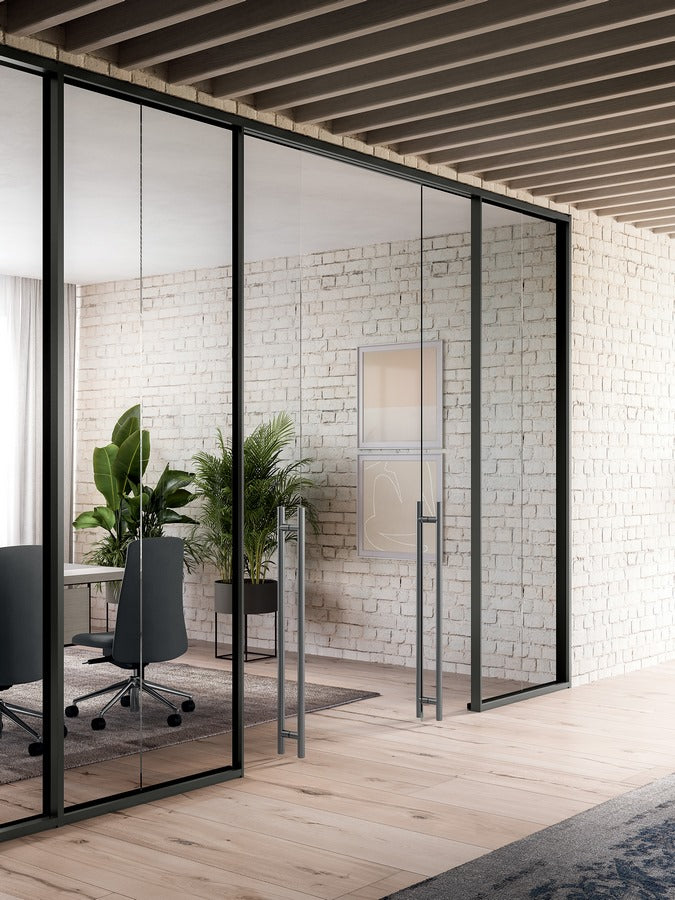 El sistema puede ser modular para articular los espacios según las necesidades: la presencia de los montantes verticales se reduce al mínimo, gracias a la estructura alternada de monoplacas de vidrio y paneles ciegos, para otorgar a los ambientes un carácter ligero y ventilado. Para una mayor discreción y privacidad, el vidrio está disponible con un revestimiento opacificante, que otorga también un efecto de vaporosidad.