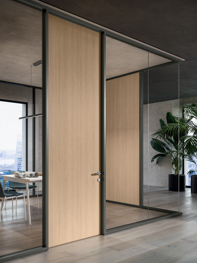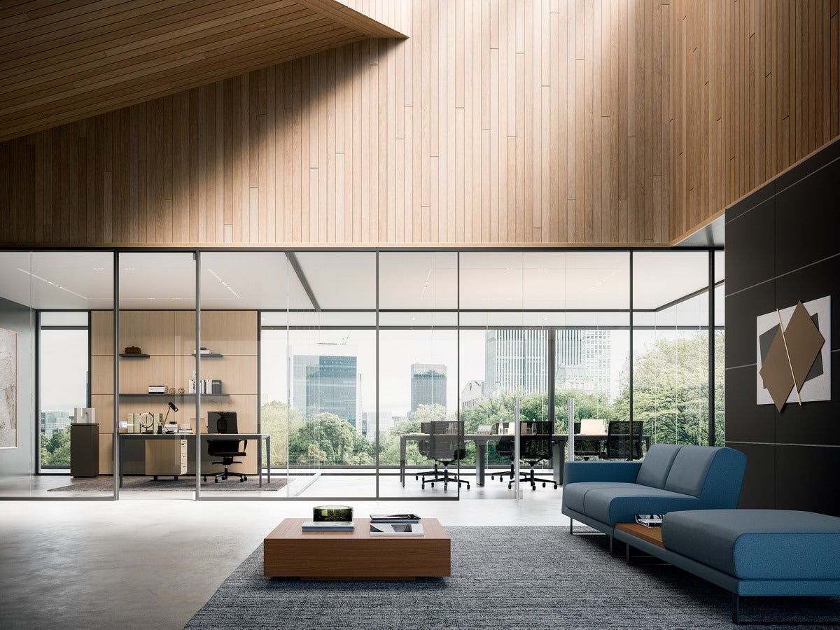 Intercambio y privacidad conviven gracias a M1, el sistema de mamparas divisorias verticales con paredes ciegas y vidriadas, que se alternan en un juego de transparencias y opacidades, entre madera y vidrio.