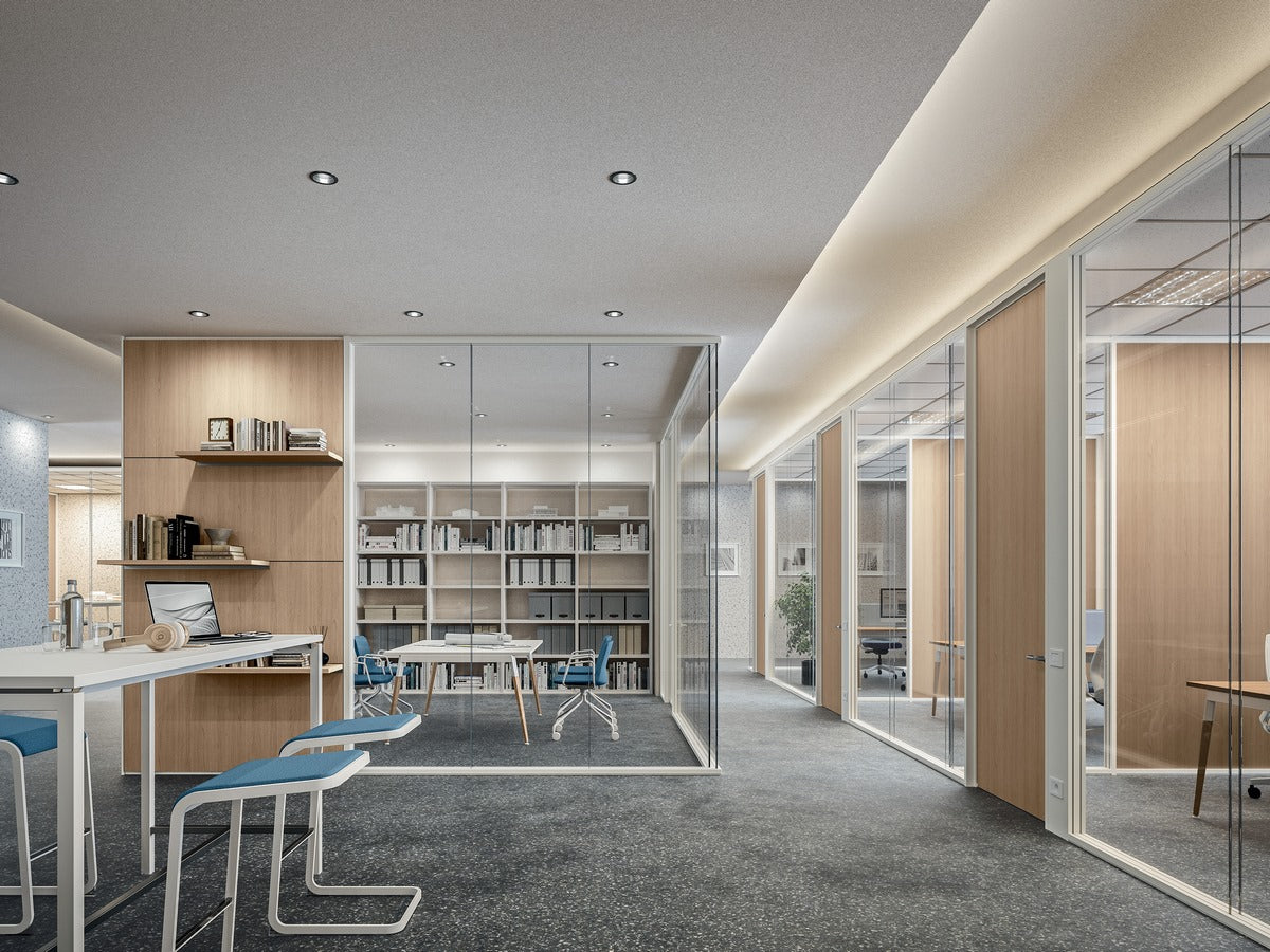 M1 se integra con todas las paredes ciegas del sistema XW, para crear ambientes operativos y de dirección, espacios abiertos y salas de reuniones, gracias a su naturaleza versátil.