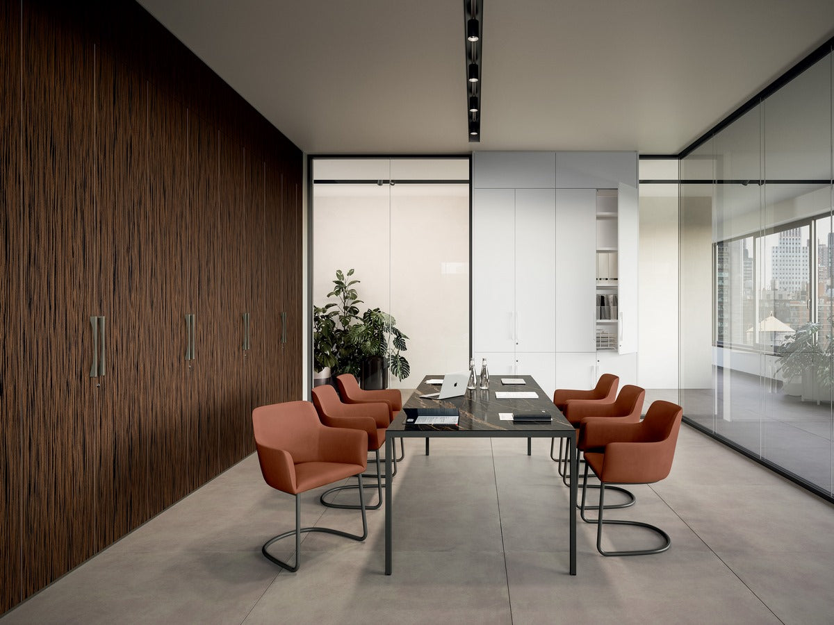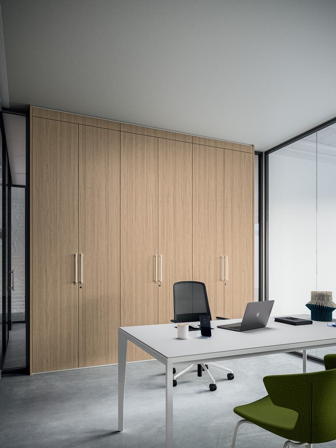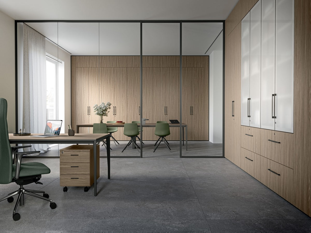 Para integrarse con coherencia en los ambientes de destino, la pared S1 se puede articular en diferentes soluciones y puede tener acabados en numerosos colores y materiales, desde vidrio o madera hasta melamina, para adecuarla a áreas operativas y compartidas, pero también a espacios direccionales, con el uso de acabados más institucionales y elegantes.