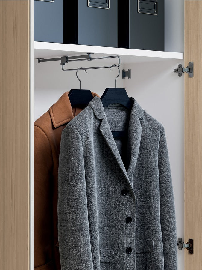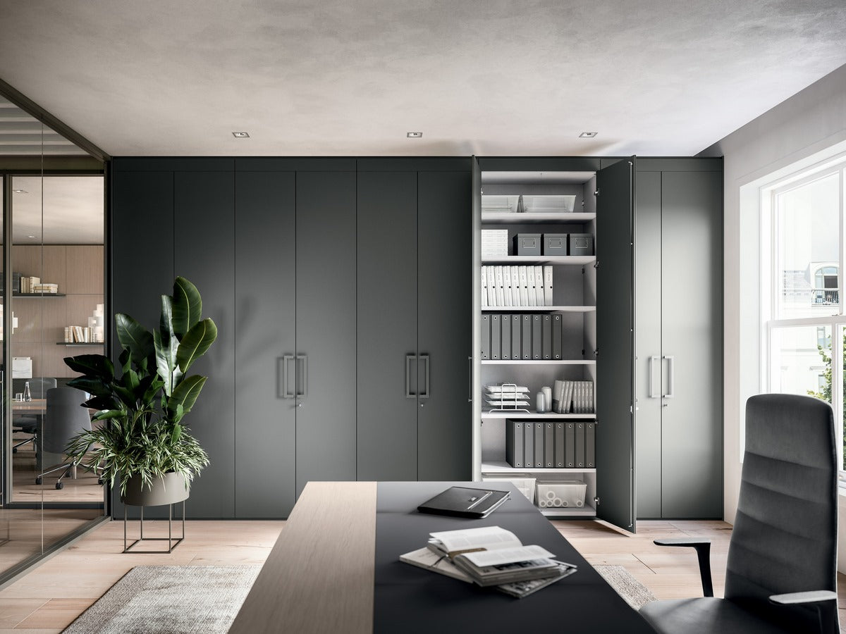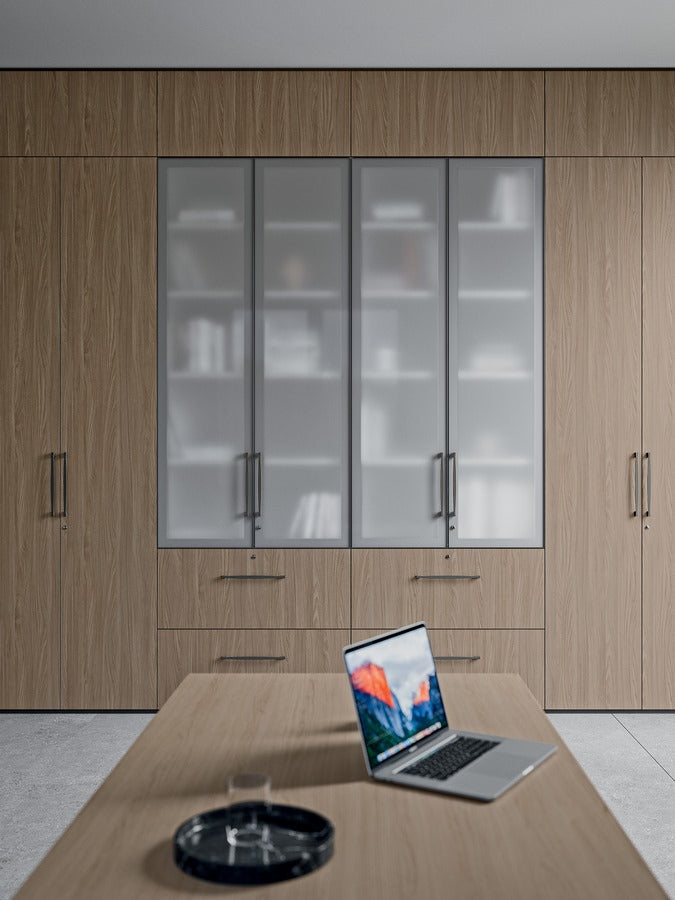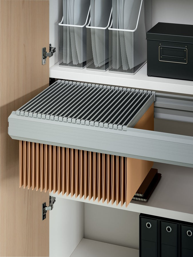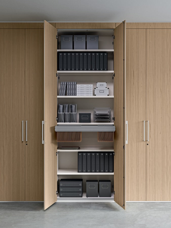 Además, para que los objetos y los documentos tengan una disposición racional, ordenada y optimizada, S1 puede acompañarse de una amplia gama de accesorios funcionales, como estantes, portacarpetas, ficheros extraíbles, espacios de archivado y percheros.