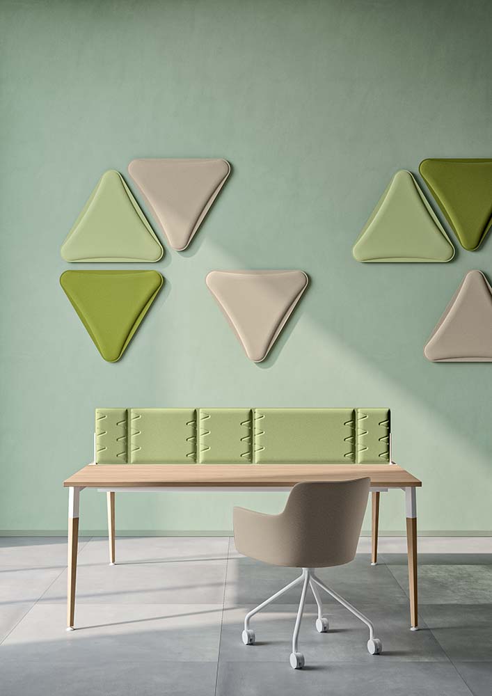 Además, el panel Screen se puede realizar también en formato pared, de dimensiones y alturas superiores, para dividir totalmente un lugar de otro y articular espacios privados en un ambiente compartido. Esta solución permite aislar completamente el lugar y obtener la propia oficina personal y, al mismo tiempo, poder comunicar libre y fácilmente con los demás.