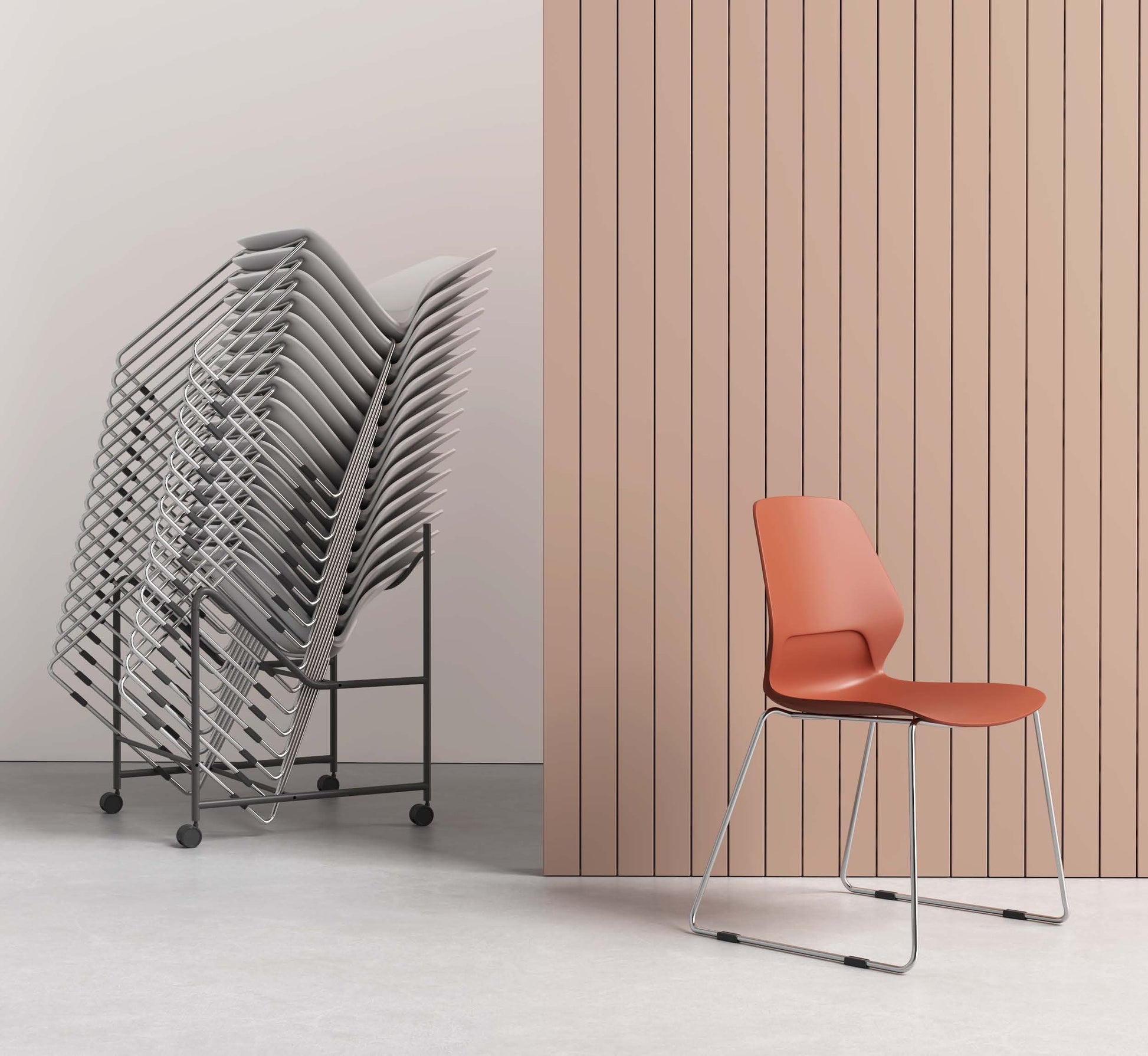 Con base patín presenta un diseño versátil y elegante que realza cualquier espacio. Ideal para despensas, cafeterías, hoteles o escuelas, su diseño apilable y ligero se integra fácilmente en diferentes entornos, combinando estilo y funcionalidad.