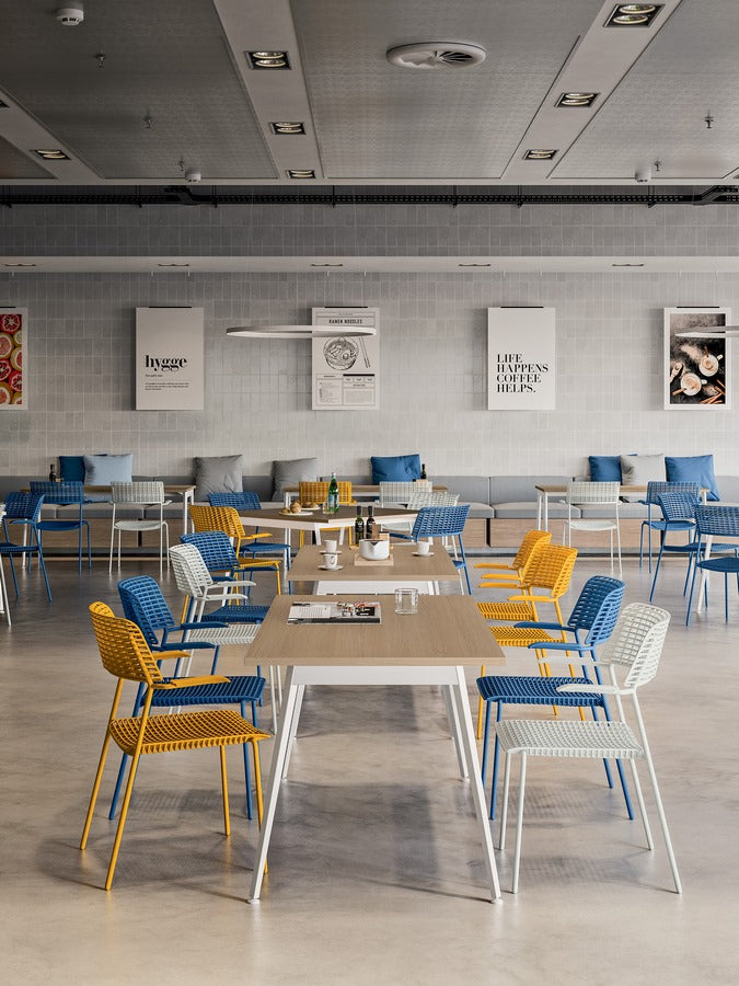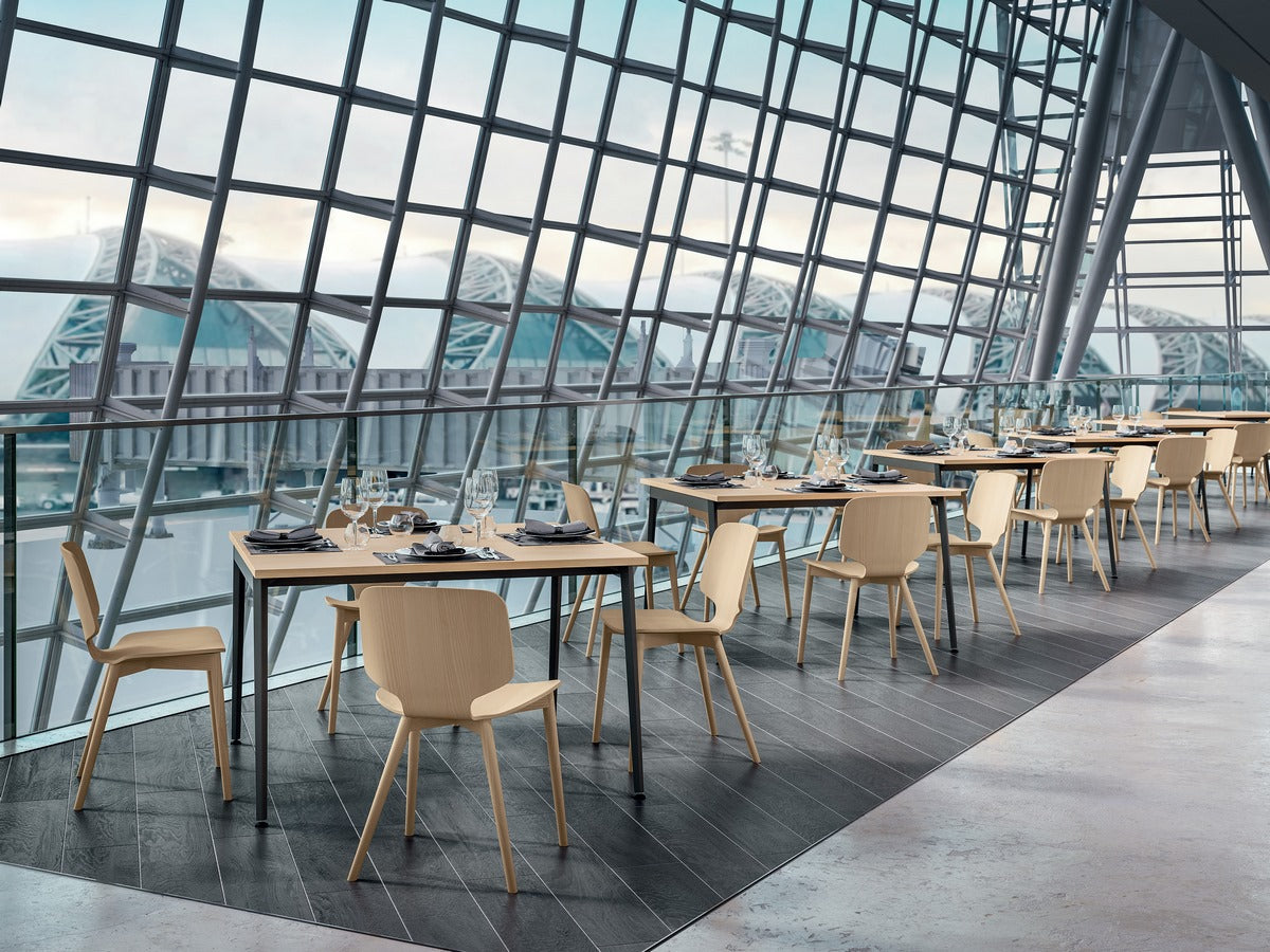 Personalizable y versátil: Three es perfecta para comedores, restaurantes o contextos residenciales en calidad de escritorio para la habitación, combinada con un asiento contract.