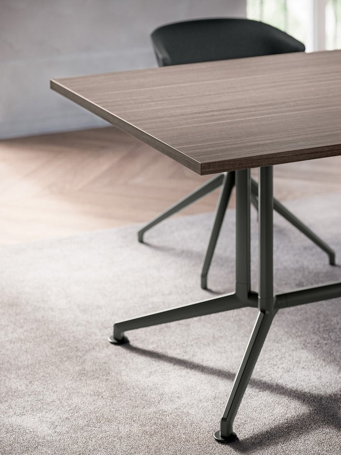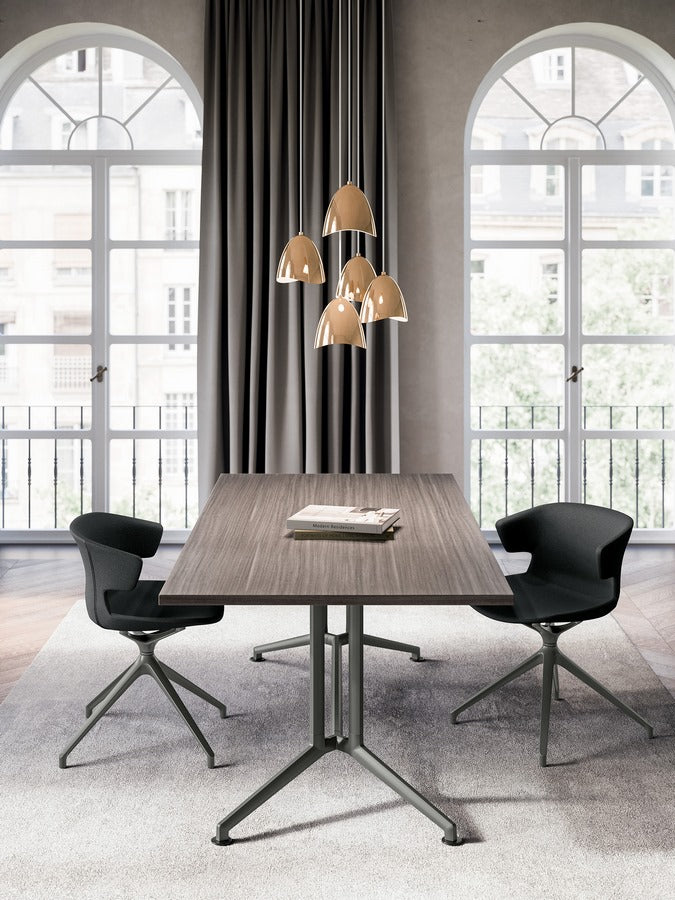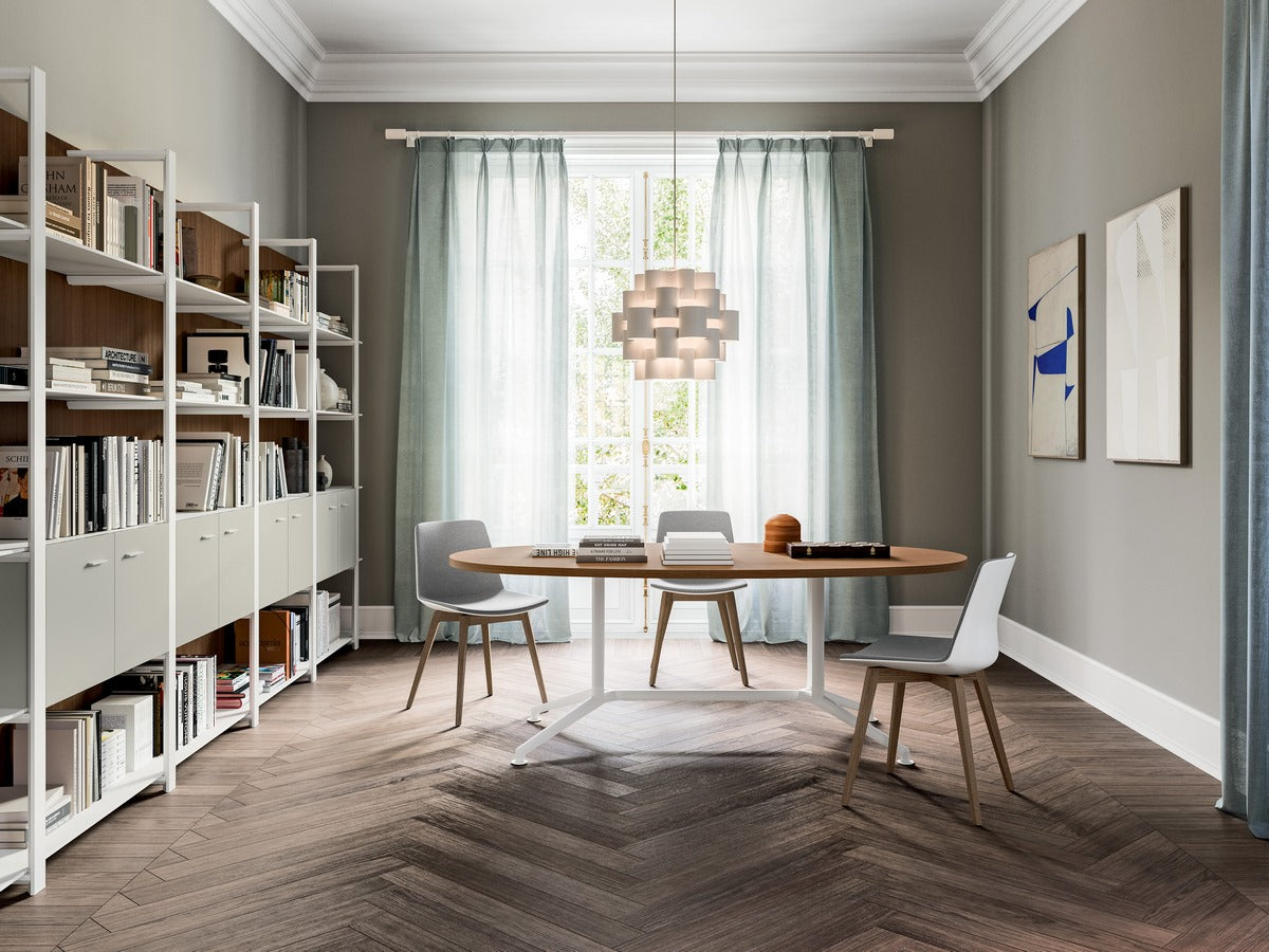 Las patas tubulares, personalizables en blanco, gris o aluminio, se ramifican en el suelo dando a la mesa un aspecto que atrae la mirada.