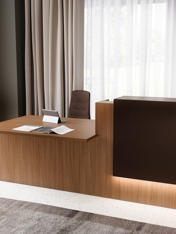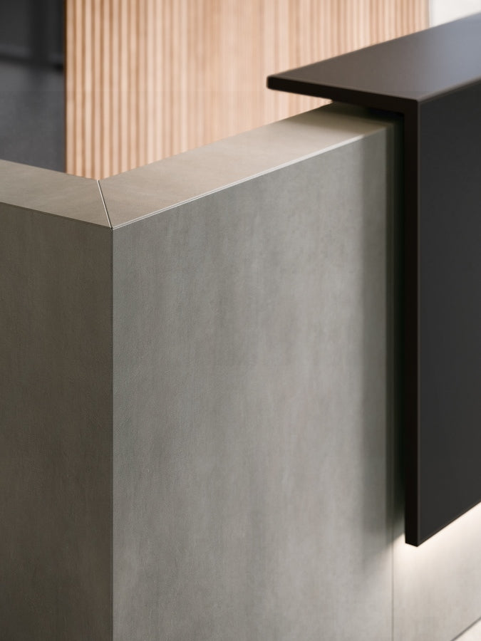 El mostrador de recepción Z2 tiene un diseño esencial, donde las funciones de recepción y trabajo están en perfecto equilibrio.