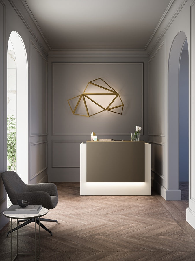 La iluminación led, que completa el mostrador de recepción Z2, enfatiza las formas y define los perímetros de manera elegante. Los cables y las tomas se ocultan mediante cómodos pasacables que garantizan el orden y la limpieza.